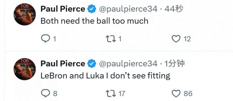 名宿皮爾斯發(fā)推寫道:“我認為詹姆斯和東契奇不合適,他倆都需要大量持球。”