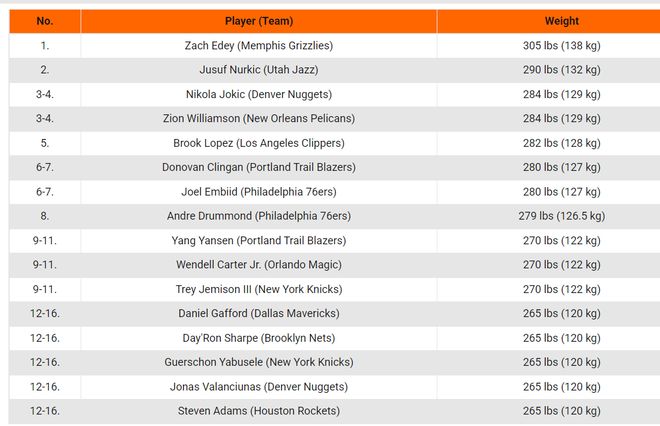 這份榜單如下:1.扎克·埃迪以305磅(約138公斤);2.努爾基奇 290磅(約132公斤);3.約基奇284磅(約129公斤)、錫安284磅(約129公斤);5.布魯克·洛佩斯282磅(約128公斤);6.克林根280磅(約127公斤)、恩比德280磅(約127公斤);8.德拉蒙德279磅(約126.6公斤);9.楊瀚森 270磅(約122公斤)、小溫德爾·卡特270磅(約122公斤)、特雷·杰米森270磅(約122公斤);12.加福德265磅(約120公斤)、戴隆·夏普265磅(約120公斤)、亞布塞萊265磅(約120公斤)、瓦蘭丘納斯265磅(約120公斤)、史蒂文·亞當斯265磅(約120公斤)。