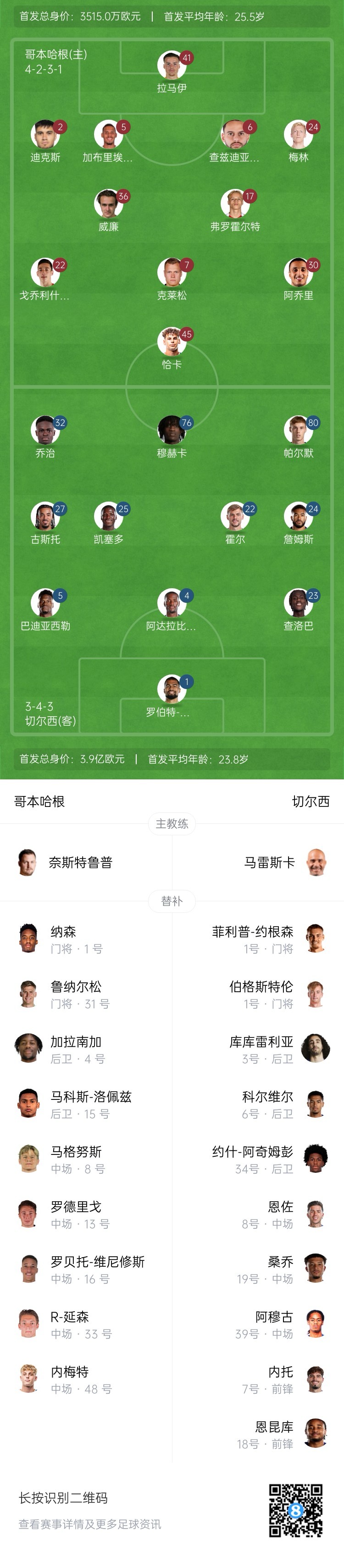 哥本哈根替補:1-納森-特羅特、31-魯納爾松、4-穆納什、15-馬科斯-洛佩茲、8-馬格努斯、13-羅德里戈-休斯卡斯、16-羅貝托-維尼修斯、33-R-延森、48-內梅特