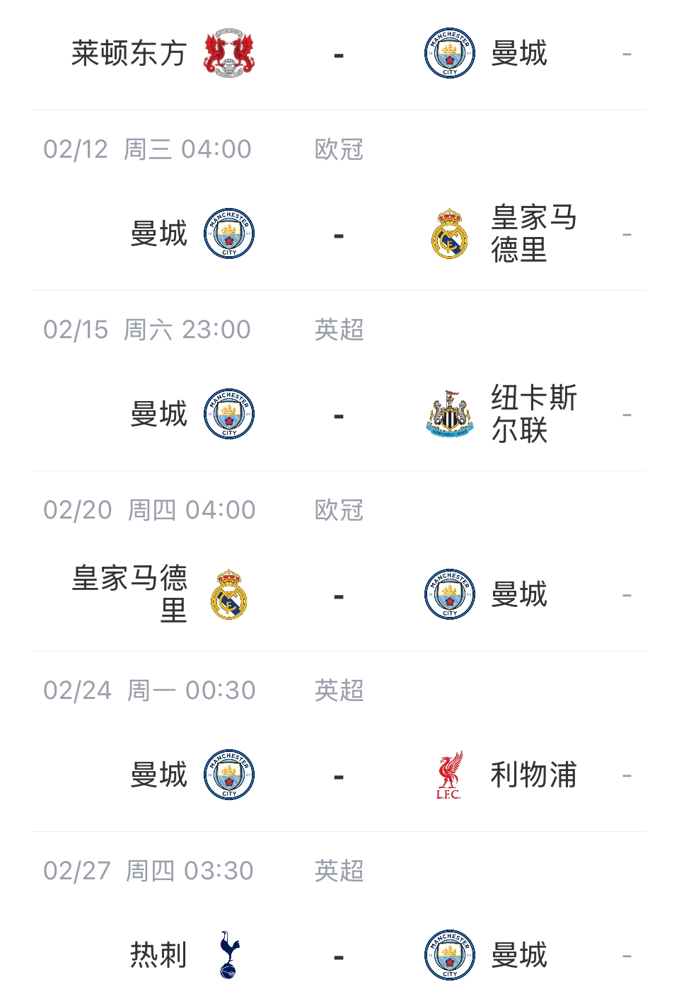 02月03日訊 英超第24輪,曼城客場1-5慘敗阿森納,本場過后,曼城本月還有多場硬仗要打。下一場客戰(zhàn)萊頓東方之后,曼城需要先主后客對陣皇馬,在英超賽場還需要對陣紐卡、利物浦、熱刺。 標簽: 足球 英超 曼城 西甲 皇家馬德里 阿森納 利物浦 熱刺 紐卡斯爾聯(lián)