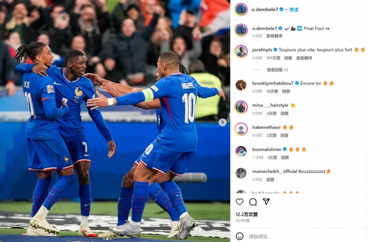 而取得進球的登貝萊也曬出和隊友相擁慶祝的合照并表示:“????????????晉級四強”。