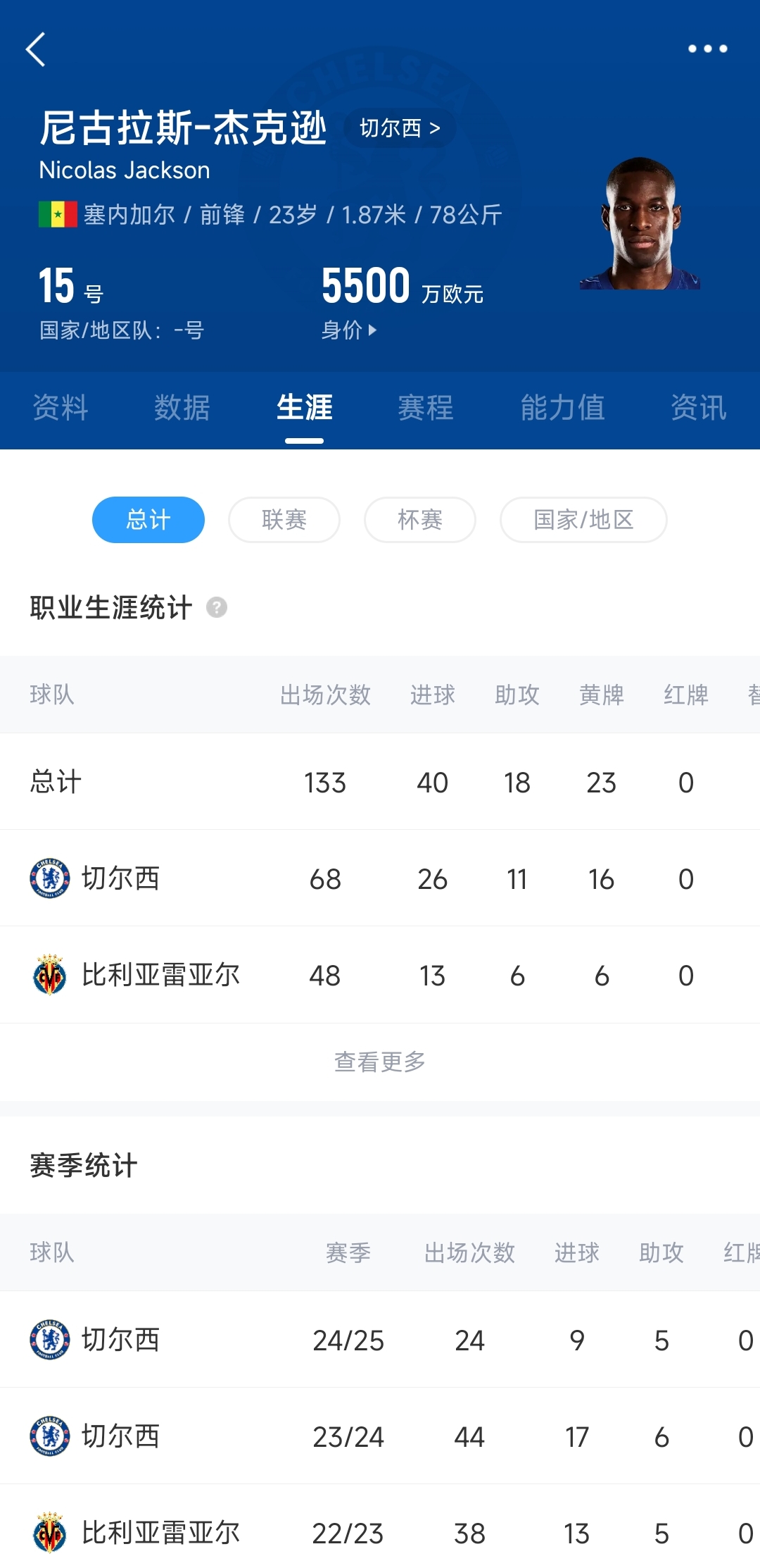 23歲的塞內(nèi)加爾前鋒杰克遜,本賽季代表切爾西出戰(zhàn)24場(chǎng)比賽,貢獻(xiàn)9球5助。目前切爾西英超24輪積43分,排名聯(lián)賽積分榜第4,落后第三名諾丁漢森林4分。